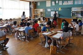 9月20日(金)、矢板市教育委員会の指導主事様を指導者としてお招きして、5時間目に1年生が、6時間目に3年生が、外国語活動の研究授業をしました。次年度より学習指導要領が全面実施になり、3・4年生が35時間の外国語活動、5・6年生が70時間の外国語科が行われる予定ですが、本校では移行措置として、本年度1・2年生が12時間、3・4年生が15時間、5・6年生が50時間、外国語活動を実施しています。新学習指導要領の趣旨を生かした授業が展開できているかを検証する授業研究です。