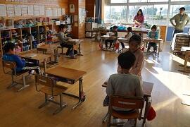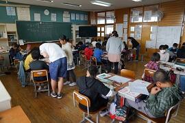 4時間めの授業の様子です。グループでの学習が多くなってきたような気がします。漢字や計算などの答えは教えてはいけませんが、やり方を教えるのは必要です。わからないことをそのままにしておくよりは、やり方を教えたり教わったりして、今日の勉強はその日のうちにできるようになった方がよいのです。だから、グループになって教えあいます。徐々に、わからないことを教わることができるようになってきました。今までは、できないということが恥ずかしかったようです。現在でも、恥ずかしい子はいますが、徐々に減ってきているようです。
