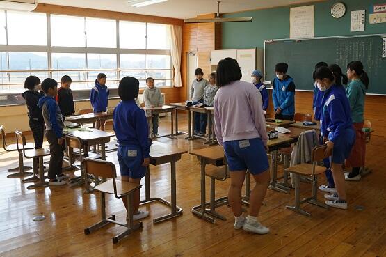 4時間めは、6年生が校庭で、3・4年生がコースに出て持久走の練習をしました。3・4年生は、走る予定のコースを歩いてみました。3・4年生が帰ってくると、6年生が校庭で練習していたので、3・4年生は6年生の応援をしていました。子どもたちは、本番に向けて、気合が入ったようでした。