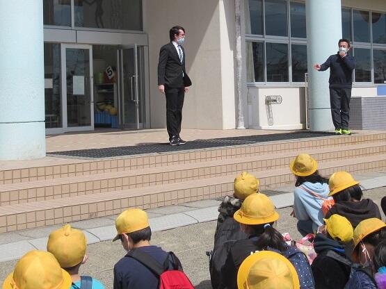 3月24日(火)の下校の時に、ALTの先生とのお別れ会を開きました。ALTの先生は、2年間外国語活動で、英語を教えていただきました。たどたどしい会話でも「Good!」とほめていただいくなどやさしく子どもと接したり、休み時間には子どもと遊ぶなど非常にフレンドリーでした。また、分厚いテキストブックで日本語を勉強したり、清掃の時間に子どもたちと一緒に草とりをするなど、積極的に日本文化を吸収しようとしていました。