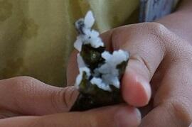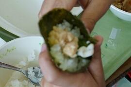 今日の給食は手巻き寿司でした。1年生にとっては初めてだったので、担任が食べ方を指導していました。具は、ひきわり納豆、キュウリとコーンのサラダ、卵不使用のマヨネーズでした。納豆にマヨネーズをあえている子が多かったでした。1・2年生の中から一部の子の巻き方を紹介します。