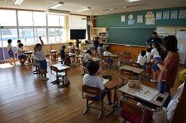 コロナの影響で、10月になった今、夏休みの思い出の学習をしています。このような長い会話文を、実際に自分が体験した夏休みの様子で答える学習でした。「すごく難しいね。」と声をかけると、「みんなできますよ。」との返事でした。6年生すごいです。