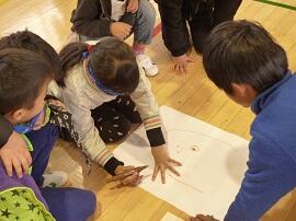 ふれあい班(縦割り班)ごとに、福わらいをして顔を完成させました。
