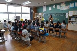 1年生の外国語の授業を、町内の小学校1・2年担任の先生と、町内保育園・こども園の先生が参観しました。小学校に入って3回目の外国語活動の授業にもかかわらず、こんなに英語をしゃべっている1年生に、参観した先生が驚いていました。本校の指導の賜物でもありますが、保育園でALTによる外国語活動をしているおかげでもあります。保育園では3歳の子が英語の歌を歌っているそうです。