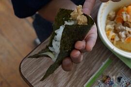 今日の給食は手巻き寿司でした。1年生にとっては初めてだったので、担任が食べ方を指導していました。具は、ひきわり納豆、キュウリとコーンのサラダ、卵不使用のマヨネーズでした。納豆にマヨネーズをあえている子が多かったでした。1・2年生の中から一部の子の巻き方を紹介します。
