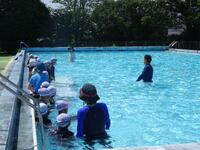 完成した「いかだ」は、水の広場のプールに浮かべて、実際に乗ってみました。