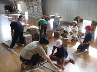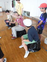 自然災害から人々を守る活動や自分たちでできる備えについて学び、ポリ袋での炊飯や緊急用トイレの作り方、段ボールベットの作り方などをグループごとに体験しました。