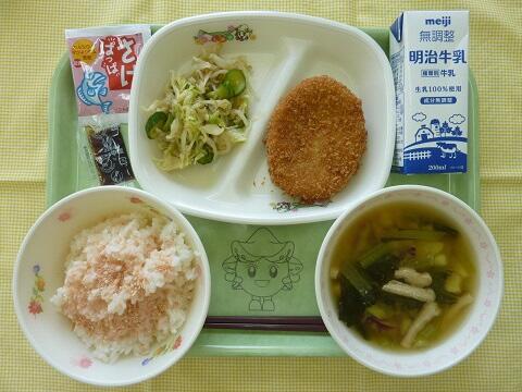 今日の塩谷町産の食材は「米、味噌」、栃木県産の食材は「牛乳、豚肉(コロッケ)、小松菜、もやし、きゅうり」です。