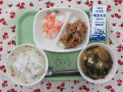 今日の塩谷町産の食材は「米、豆腐」、栃木県産の食材は「豚肉、牛乳、にんじん、小松菜、ねぎ、もやし、ごぼう」です。