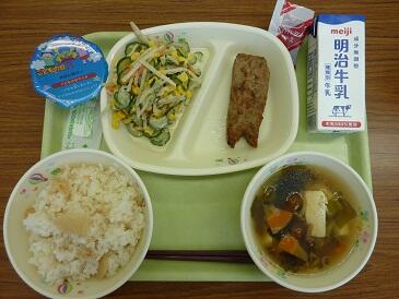 今日の献立は、わかめご飯 カレイの竜田揚げ 春雨サラダ じゃがいものみそ汁 牛乳です。