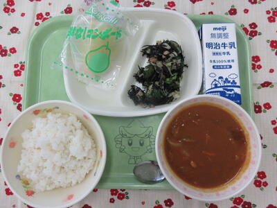 献立は「ごはん、ポークカレー、アスパラサラダ、県産ヨーグルト、牛乳」です。