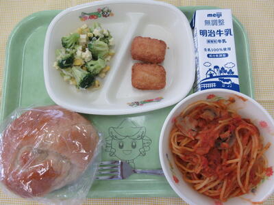 献立は「紅茶パン、ツナとトマトのスパゲティ、豆腐ナゲット(小学生2個、中学生3個)、ブロッコリーとチーズのサラダ、牛乳」です。