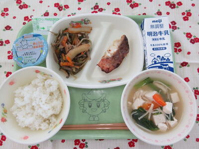 献立は「ごはん、メバルの粕漬焼き、きんぴら、豆腐と小松菜のみそ汁、歯と口の健康週間ゼリー、牛乳」です。