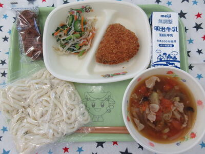 献立は「トマトつけ汁うどん、かぼちゃひき肉フライ、小松菜とじゃこのサラダ、ワッフルドッグ、牛乳」です。