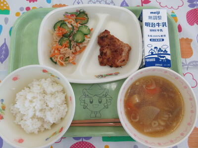 献立は「バターロールパン、鶏肉のバーベキューソースかけ、ツナレモンサラダ、コーンと白いんげんのポタージュ、牛乳、お祝いケーキ(小学生のみ)」です。