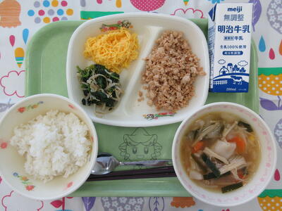 今日の献立は、「セルフ三食丼(ごはん・鶏そぼろ・錦糸卵・おひたし)、ワンタンスープ、牛乳」です。
