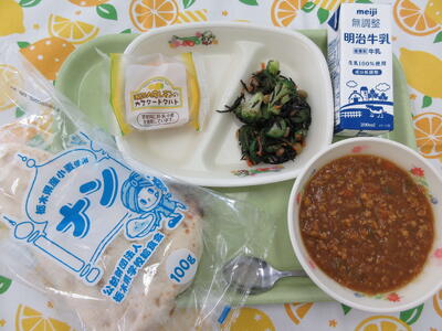 今日の献立は、「ナン、キーマカレー、ひじきと豆のサラダ、レモンタルト、牛乳」です。