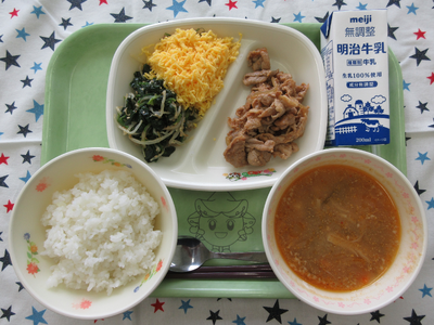 今日の献立は、「ごはん、焼き肉、豆腐とニラのスープ、フルーツヨーグルトあえ、牛乳」です。