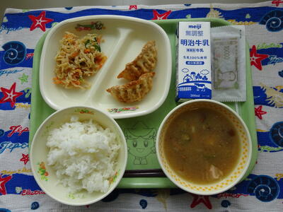 今日の献立は、「ごはん 揚げ餃子、切干大根の和え物、オクラとなめこのみそ汁、味のり、牛乳」です。