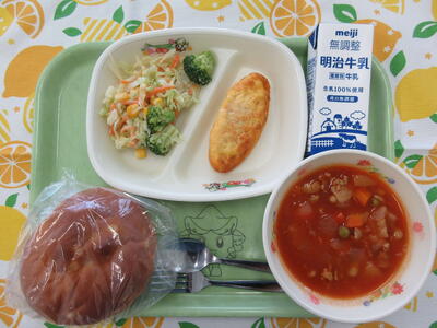 今日の献立は、「シェルパン、クロケット、小袋ソース、ラタトゥイユ、ABCスープ、ブラマンジェ風デザート、牛乳」です。