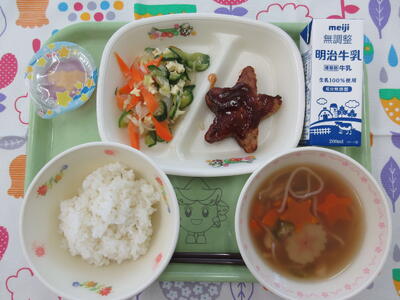 今日の献立は、「ごはん、星型ハンバーグ ケチャップソースかけ、短冊サラダ、七夕汁、七夕ゼリー、牛乳」です。