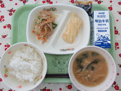 今日の献立は、「ごはん、さわらのみそ漬け焼き、春雨サラダ、にら入りかきたま汁、牛乳」です。