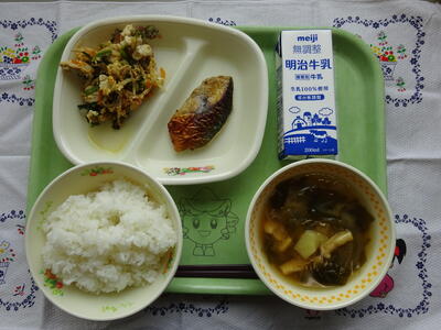 今日の給食は、「ごはん、モロの揚げ煮、ツナのり酢あえ、湯葉のみそ汁、牛乳」です。