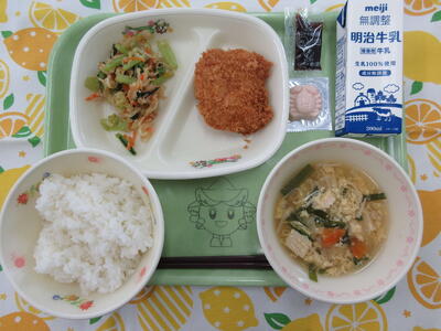 今日の献立は、「ごはん、とんかつ、小袋ソース、ごまずあえ、高野豆腐と卵のスープ、チーズ(中学校のみ)、牛乳」です。