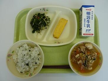 今日の献立は、わかめご飯 厚焼き玉子 ほうれん草ともやしのおひたし 肉豆腐 牛乳です。