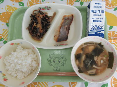 献立は「ごはん、ミナミカマスの米麴焼き、ひじきと湯葉の炒め煮、豆腐とわかめのみそ汁、牛乳」です。