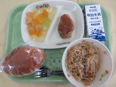 献立は「バターロールパン、鶏肉のバーベキューソースかけ、五目炒めビーフン、フルーツゼリーポンチ、牛乳」です。