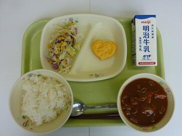 今日の献立は、ハヤシライス ハートオムレツ コールスローサラダ 牛乳です。