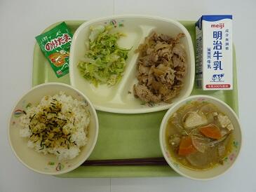 今日の献立は、ご飯 焼き肉 ボイルキャベツ けんちん汁 のりたまごふりかけ 牛乳です。