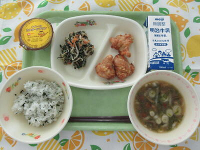 今日は玉生小のリクエスト献立で、「わかめごはん、鶏のからあげ(小学校2個、中学校3個)、ツナのり酢あえ、なめこ汁、プリン、牛乳」です。