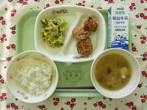 今日の献立は、ごはん 鶏肉の唐揚げ(小学校2個、中学校3個) 海藻サラダ なめこ汁 フルーツ杏仁です。