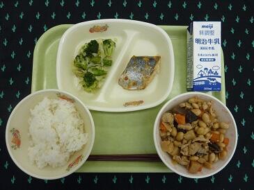 今日の献立は、ご飯 さわらの紅葉漬け グリーンサラダ 五目豆 牛乳です。