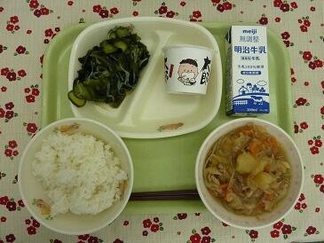 今日の献立は、ご飯 納豆 わかめの酢の物 肉じゃが 牛乳です。