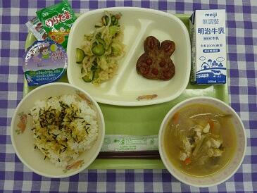 今日の献立は、ご飯 うさぎハンバーグ 野菜のキムチ和え けんちん汁 月見ゼリー 牛乳です。