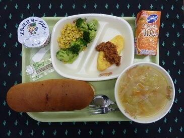 今日の献立は、チーズパン オムレツのミートソース ブロッコリーのサラダ コンソメスープ 県産生乳ヨーグルト オレンジジュースです。