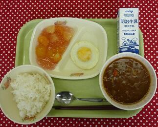 今日の献立は、ポークカレー 目玉焼き フルーツのゼリー和え 牛乳です。