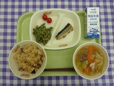今日の献立は、松茸風味ご飯 さんまの塩焼き いんげんのごま和え ミニトマト 豚汁 牛乳です。