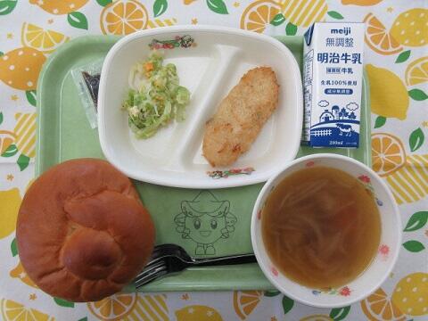 今日の献立は、スライスミルクパン 白身魚フライ・小袋ソース チーズサラダ ミートボールスープ 牛乳です。