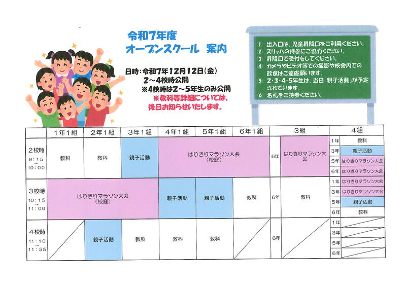 先日のはりきりマラソン大会の延期に伴い、12月12日(金)のオープンスクールの日に「各教科の授業」「親子活動」「はりきりマラソン大会」を実施します。このメールに添付されているPDFデータをご確認いただき、参観予定の検討にご活用ください。なお、「各教科の授業」の詳細につきましては、後ほど通知いたします。