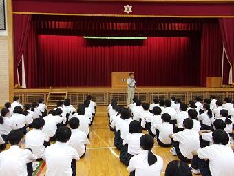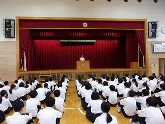 8/27(火)朝、体育館アリーナで標記の集会を行いました。