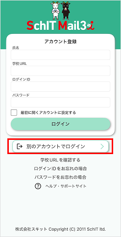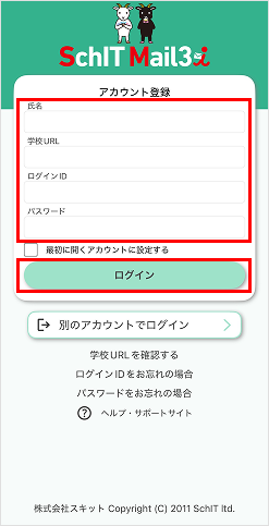 氏名・学校URL・ログインID・パスワードを入力し、[ログイン]を押下します。