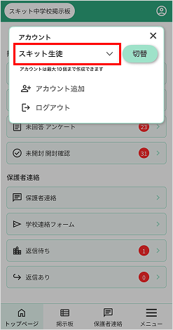 アカウント名の枠内を押下し、表示したいアカウント名を選択後、[切替]を押下します。