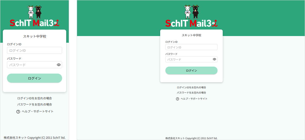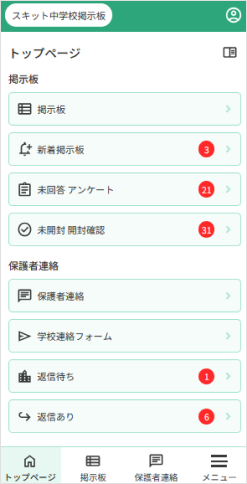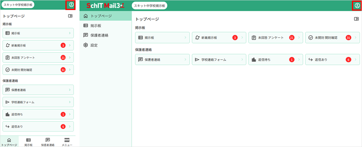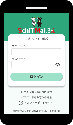 ブラウザ パソコンのedgeやChromeブラウザ、スマートフォンのChromeやsafariブラウザからも掲示板にログインできます。 パソコン表示 スマートフォン表示 ログイン・ログアウト ログイン 「SchIT Mail3i掲示板」にアクセスしてください。 学校から配信されたメールの「掲示板URL」からアクセスしてください。 ログインIDとパスワードを入力し、[ログイン]を押下します。 トップページの画面が表示されます。 パソコン表示 スマートフォン表示 Info ⇒ログインID・パスワードがわからない場合はこちら ログアウト 画面右上のアカウントアイコンを押下します。 ログアウトを押下します。 [OK]を押下すると、ログアウトします。