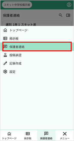 ナビゲーションバーの保護者連絡を押下します。