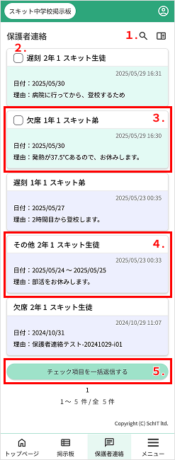 5. 一括返信ボタン…チェックを入れた保護者連絡を一括返信できる