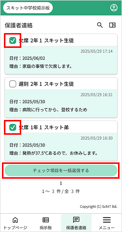 1. 返信する保護者連絡のチェックボックスにチェックを入れて、[チェック項目を一括返信する]を押下します。